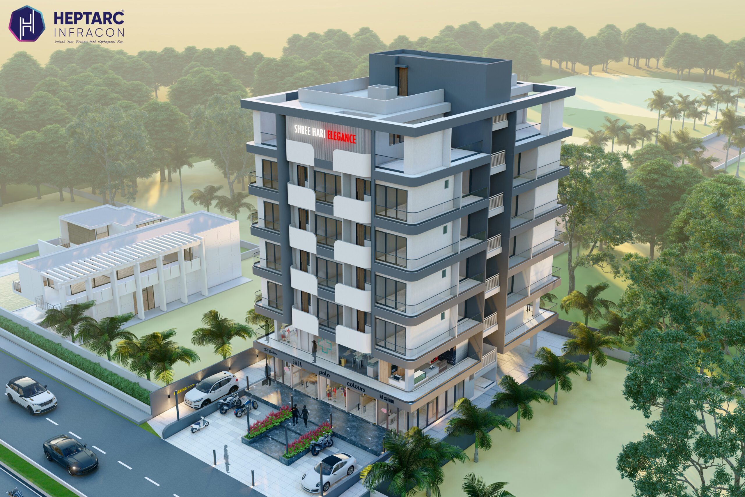 Strategically located opposite the scenic Akwada Lake on Ghogha Road, this G+6 high-rise project redefines the synergy between commercial potential and residential comfort.